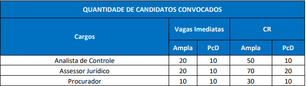 - Cargos: Analista de Controle, Assessor Jurídico e Procurador.