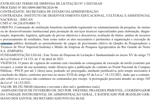 Isso porque o Idecan foi definido como banca organizadora do certame, e o Direção Concursos obteve acesso EXCLUSIVO ao contrato firmado com a banca.