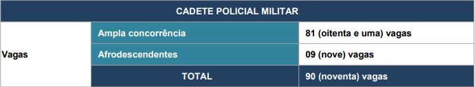 O edital PM PR oferta 90 vagas de nível superior para Cadete Policial Militar, distribuídas da seguinte forma: