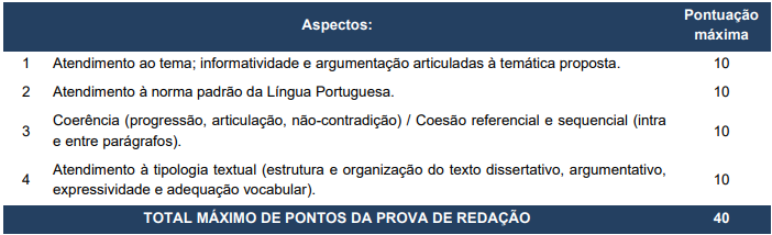 A Redação da Prova Discursiva serão avaliadas observando os critérios de correção estabelecidos no quadro abaixo: