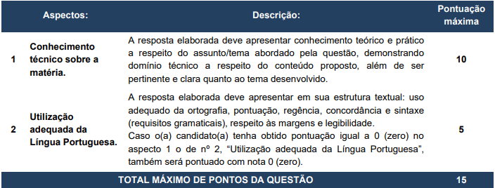 As Questões Discursivas da Prova Discursiva serão avaliadas observando os critérios de correção estabelecidos no quadro abaixo: