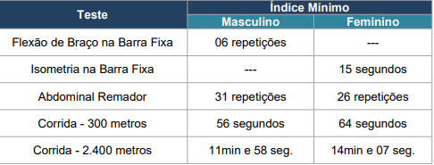 O Exame de Capacidade Física (ECAFI) será composto pelos testes, conforme o quadro a seguir: