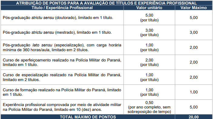 A Prova de Títulos e Experiência Profissional (PTEP) será avaliada na escala de 0 (zero) a 20 (vinte) pontos e terá a atribuição de pontuação para cada titulação e para o tempo de experiência profissional conforme composição a seguir: