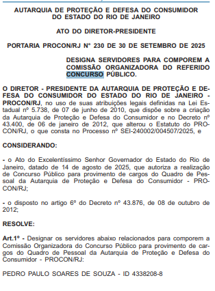 Um novo passo foi dado para a realização do concurso Procon RJ (Autarquia de Proteção e Defesa do Consumidor do Estado do Rio de Janeiro): foi instituída a comissão organizadora do certame!