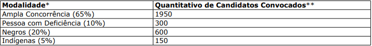 Para fins de convocação para correção da Redação, serão considerados classificados os candidatos aprovados na prova objetiva, observando-se o quantitativo máximo de candidatos por modalidade, conforme tabela abaixo, respeitando os empatados na última posição:
