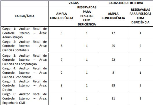 Serão ofertadas 20 vagas imediatas, além de formação de cadastro reserva para o cargo de Auditor Fiscal de Controle Externo. O salário inicial é de até R$ 17.928,13, considerando vencimento e gratificação de desempenho.