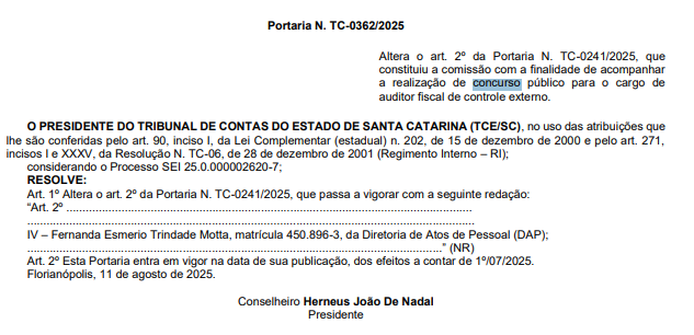 Confira, abaixo, documento publicado em Diário Oficial do TCE SC: