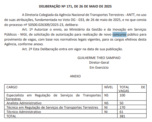 Além disso, vale lembrar que a Agência Nacional de Transportes Terrestres terá 50 vagas de nível médio para o cargo de Técnico em Regulação de Serviços de Transportes Terrestres, a serem oferecidas por meio da segunda edição do Concurso Nacional Unificado (CNU 2025), com edital previsto para julho de 2025.