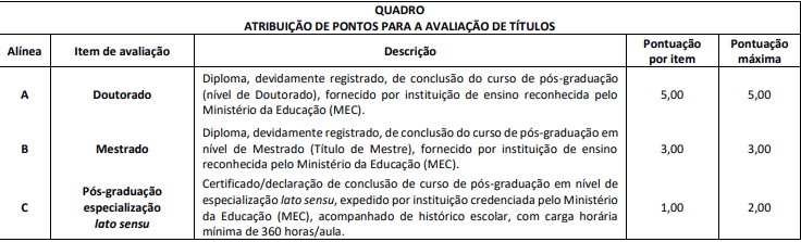 A avaliação de títulos, de caráter classificatório, valerá 10,00 pontos, ainda que a soma dos valores dos títulos apresentados seja superior a esse valor.