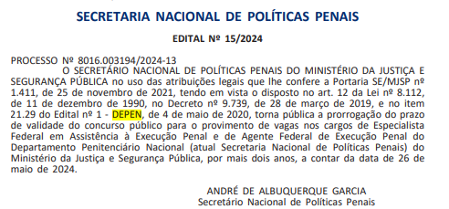 Confira, na íntegra, o documento de prorrogação do Concurso Depen: