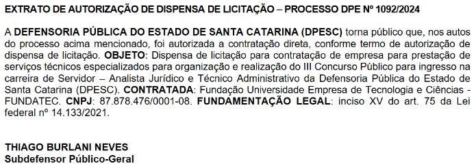 A autorização de dispensa de licitação indicando a Fundatec como responsável pelo certame foi divulgada no Diário Oficial da Defensoria do estado, no último 23 de junho.