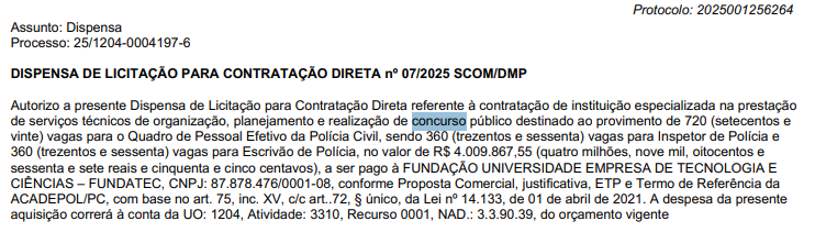Isso porque foi publicado em Diário Oficial do estado nesta sexta-feira (2/5), autorização de dispensa de licitação que confirma a Fundação Universidade Empresa de Tecnologia e Ciências (Fundatec) como banca organizadora do certame.