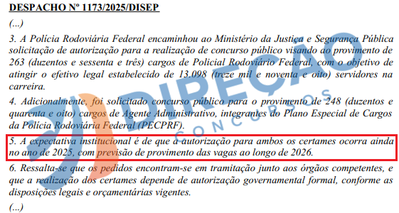 Segundo a DISEP, os pedidos encontram-se em tramitação junto aos órgãos competentes, porém, a expectativa institucional é de que a autorização para ambos os certames ocorra ainda no ano de 2025, com previsão de provimento das vagas ao longo de 2026.
