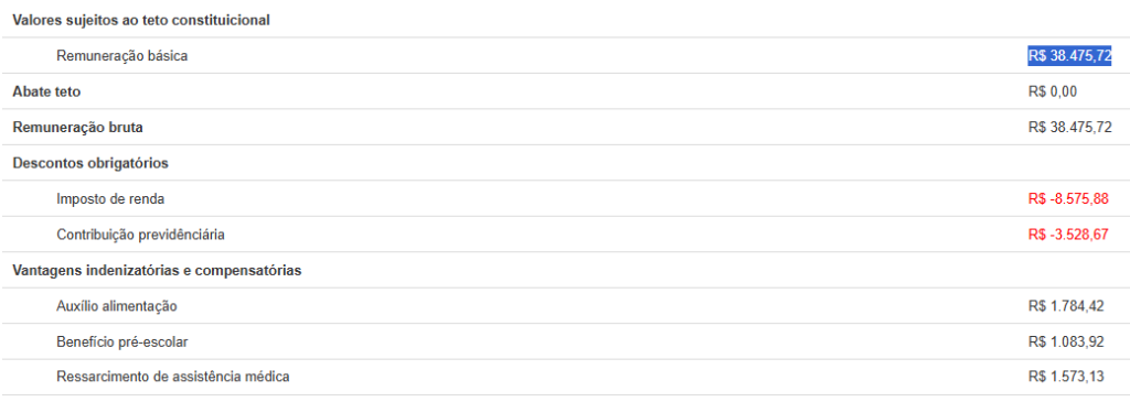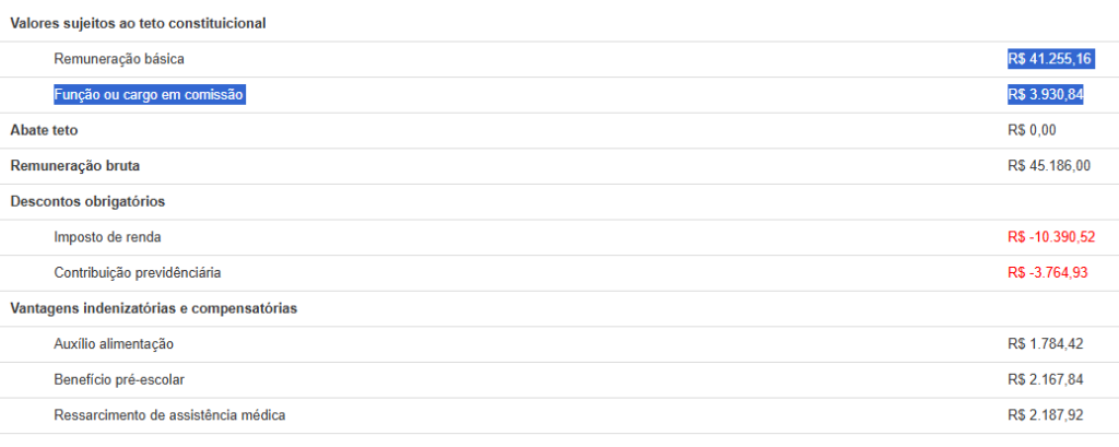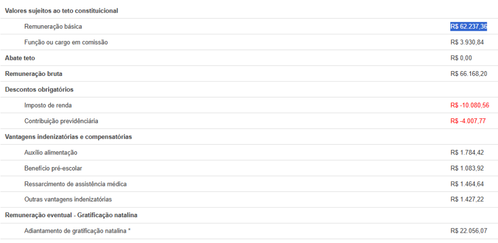 Por fim, veja como fica a remuneração de um Auditor do TCU na Classe Especial – Padrão 13, com Função de Confiança FC-3, acrescentando a gratificação natalina: