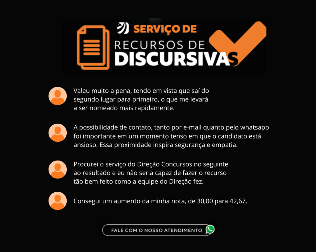 O Direção Concursos está com uma lista de antecipação para recursos, garantindo que você receba suporte e material preparado com prioridade assim que os prazos abrirem. Veja o que dizem nossos alunos sobre o nosso Serviço de Recursos: