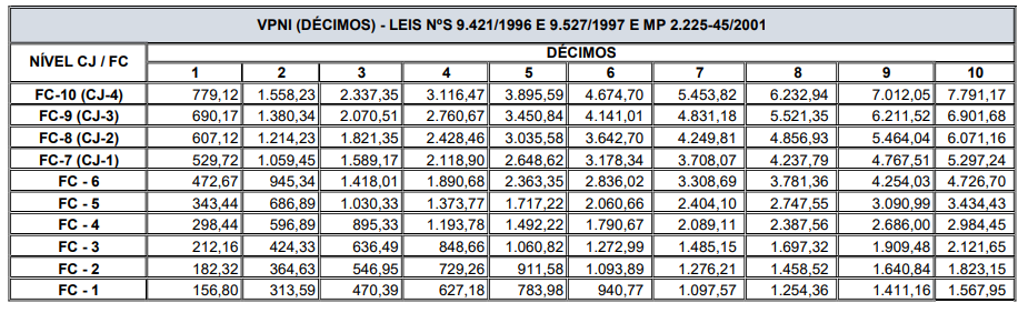 A tabela remuneratória atualizada em fevereiro de 2025, prevê os seguintes valores: