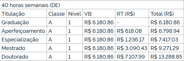 Para a carreira docente, as remunerações vão de R$ 6.180,86 a R$ 13.288,85, conforme conforme tabela abaixo: