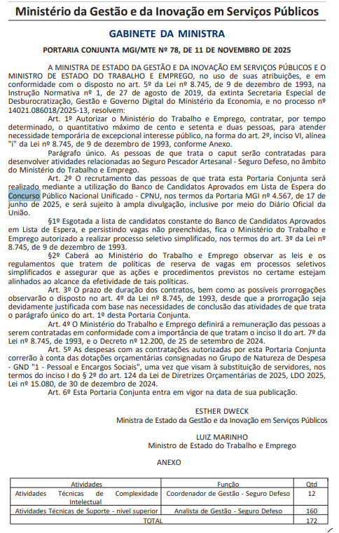 Esta é a segunda autorização do tipo em poucos dias. Na última segunda-feira (10/11), o MGI já havia publicado a Portaria Conjunta nº 77/2025, que permitiu a contratação de 100 temporários para atuar na análise de processos de prestação de contas no MTE.