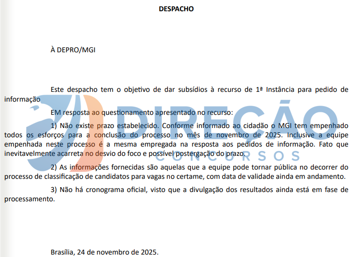 Em resposta, o MGI afirmou que as informações fornecidas são apenas aquelas que a equipe pode tornar públicas durante o decorrer do processo de classificação de candidatos para vagas no certame.