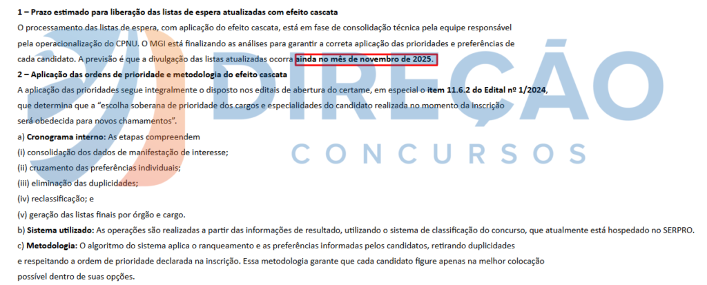 O Ministério da Gestão e da Inovação em Serviços Públicos (MGI) informou, em despacho acessado pela equipe de jornalismo do Direção Concursos nesta terça-feira (4/11), que a divulgação das listas de espera atualizadas do CNU 2024 (Concurso Público Nacional Unificado) e a publicação do cronograma oficial das próximas etapas do certame estão previstas para ocorrer ainda neste mês de novembro de 2025.