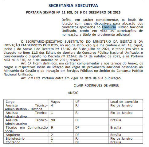 Esta portaria complementa o processo iniciado no final de novembro, quando o MGI publicou as listas de espera atualizadas do CNU 2024 e a convocação para o preenchimento de 3.910 vagas adicionais e remanescentes.