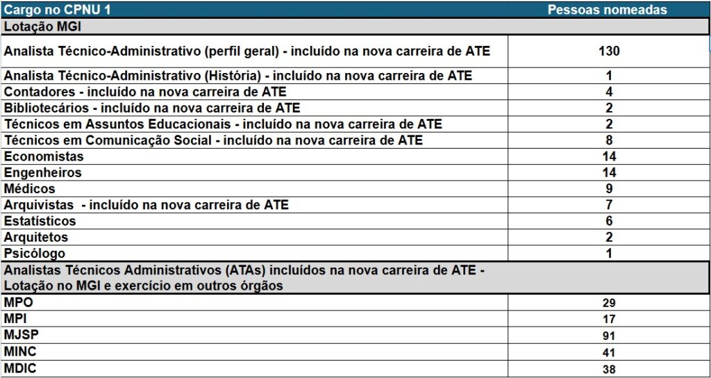 Ao todo, 370 pessoas que concorreram originalmente a cargos com nomenclaturas anteriores — como Analistas Técnicos Administrativos (ATAs), Técnicos em Comunicação Social e Contadores — foram absorvidas pela nova carreira. Essas nomeações são feitas pelo MGI, órgão supervisor da carreira, independentemente do órgão ao qual a vaga estava vinculada no edital.