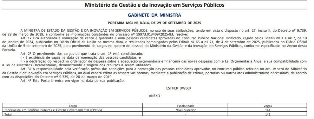 Foi autorizada a nomeação de aprovados do Concurso Nacional Unificado (CNU 2024) para a carreira de Especialista em Políticas Públicas e Gestão Governamental – EPPGG do Ministério da Gestão e da Inovação em Serviço Público (MGI).