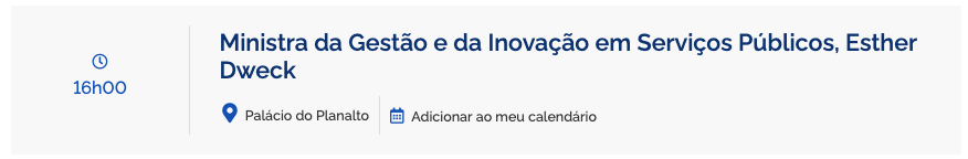 De acordo com a agenda oficial do presidente Luiz Inácio Lula da Silva, está prevista para as 16h desta terça-feira uma reunião com a ministra da Gestão e Inovação, Esther Dweck, como é possível ver abaixo: