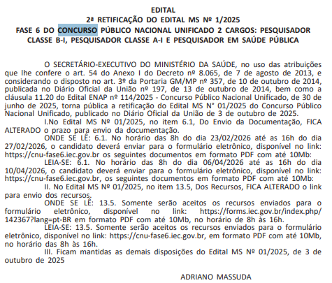Os candidatos aos cargos de Pesquisador Classe B-I, Pesquisador Classe A-I e Pesquisador em Saúde Pública do Concurso Nacional Unificado (CNU 2025) – Bloco Seguridade Social devem ficar atentos a uma importante atualização. O Ministério da Saúde publicou, nesta sexta-feira (28/11), em Diário Oficial da União, a 2ª Retificação do Edital MS Nº 1/2025, referente à Fase 6 do certame.