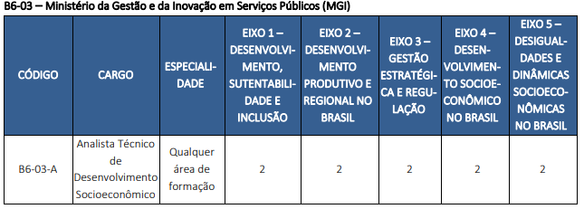 Presente no Bloco 6 – Desenvolvimento Socioeconômico, o cargo exige nível superior em qualquer área de formação e conta com salário inicial de R$ 9.711,00.