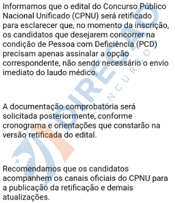 Em comunicado divulgado neste 3 de julho, a banca informou o edital será novamente retificado para esclarecer que, no momento da inscrição, o candidato que deseja concorrer na condição de PCD deverá apenas assinalar a opção correspondente, sem a necessidade imediata de envio do laudo médico.