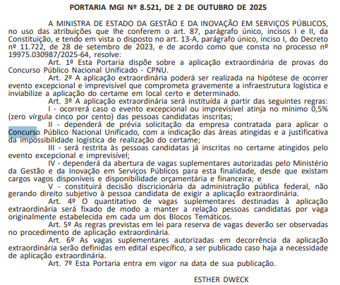 É importante destacar que a publicação da portaria é uma medida preventiva. As provas objetivas do CNU 2025 estão mantidas para o próximo domingo, 5 de outubro.