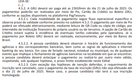 A retificação alterou o item 4.5.2 do edital, referente ao pagamento da taxa de inscrição. Agora, o pagamento poderá ser feito, também por cartão de crédito, além de pix e boleto GRU.