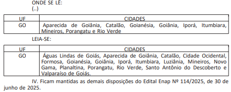 Por fim, a última alteração refere-se a inclusão de 8 cidades do estado de Goiás dentre as cidades que terão provas aplicadas. São elas: Águas Lindas de Goiás, Cidade Ocidental, Formosa, Luziânia, Novo Gama, Planaltina, Santo Antônio do Descoberto e Valparaíso de Goiás.