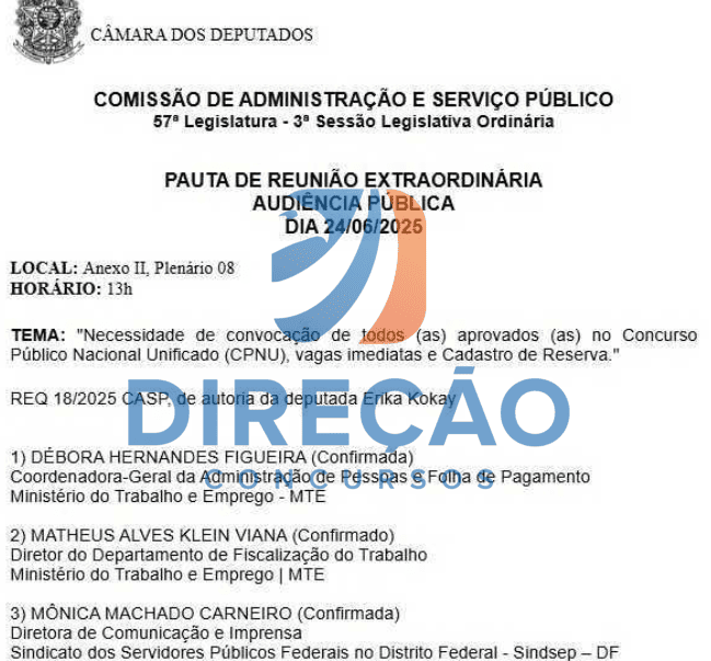 Trata-se de uma audiência pública agendada para ocorrer na próxima terça-feira, 24 de junho, na Câmara dos Deputados, em que estará em pauta a necessidade de convocação de todos os aprovados no Concurso Nacional Unificado de 2024, tanto nas vagas imediatas quanto em cadastro reserva.