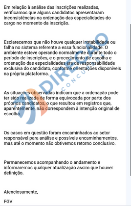 Em resposta, a banca FGV afirma que não registrou instabilidade ou falha no sistema referente à funcionalidade e reforça que o procedimento de escolha e ordenação das especialidades era de responsabilidade exclusiva do candidato.
