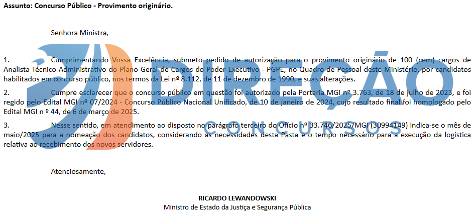 Nesse contexto, uma minuta foi elaborada pelo MJSP com pedido de autorização para a nomeação de 100 aprovados no cargo de Analista Técnico-Administrativo. A minuta deve ser assinada em breve pelo ministro Ricardo Lewandowski e encaminhada à ministra do MGI, Esther Dweck.