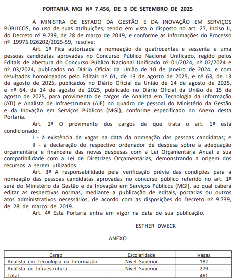 A portaria que autoriza a nomeação dos novos servidores foi publicada em Diário Oficial da União nesta quinta-feira, 4 de setembro. O documento contempla 461 vagas de nível superior distribuídas entre os cargos seguintes: