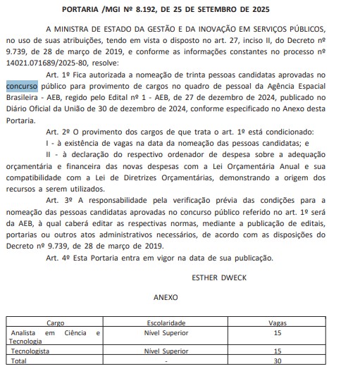 A nomeação dos aprovados no concurso da Agência Espacial Brasileira (AEB) foi autorizada pelo Ministério da Gestão e Inovação (MGI). A portaria que libera a nomeação dos novos servidores foi publicada em Diário Oficial da União nesta sexta-feira, 26 de setembro.