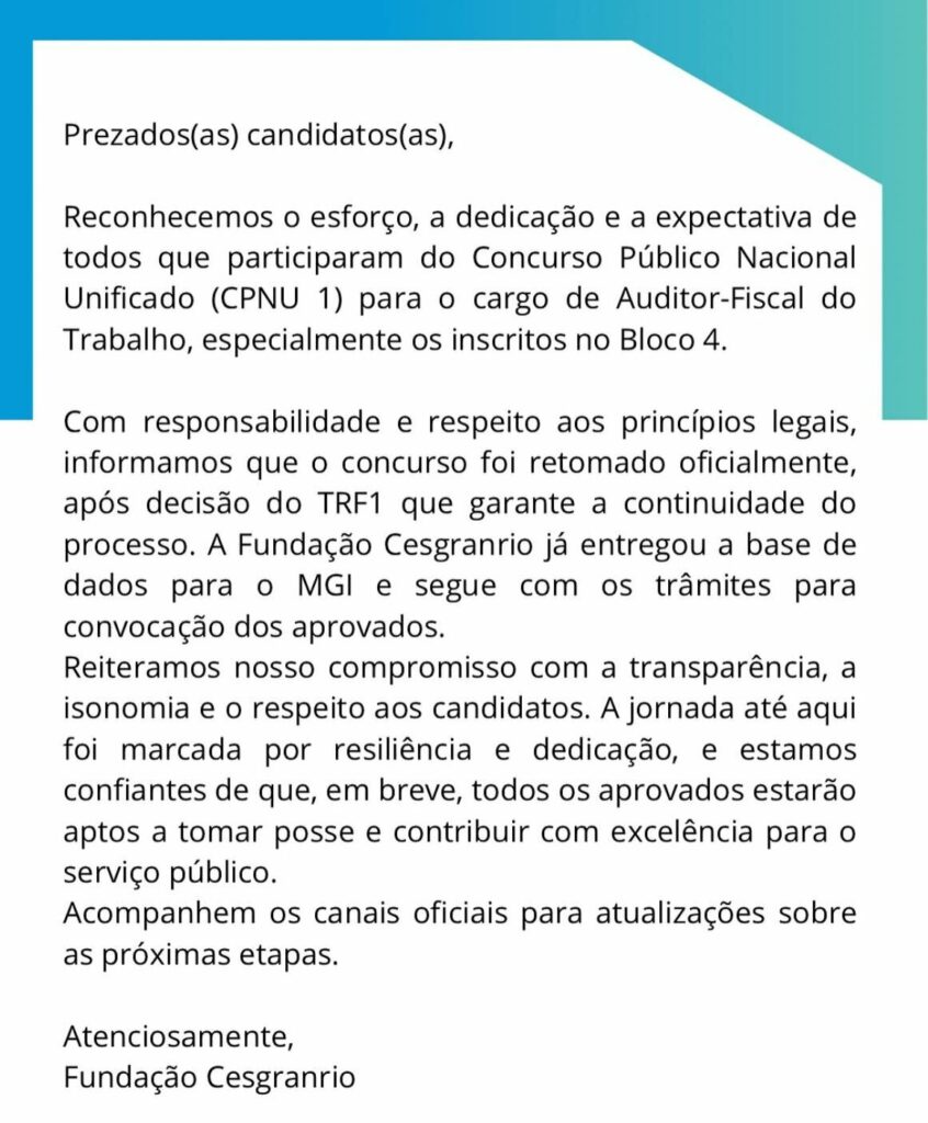 A Fundação Cesgranrio emitiu comunicado oficial nesta terça-feira (5/10) aos candidatos do Concurso Nacional Unificado (CNU) 2024 para o cargo de Auditor Fiscal do Trabalho (AFT), informando a retomada oficial do certame após decisão judicial favorável do Tribunal Regional Federal da 1ª Região (TRF1).