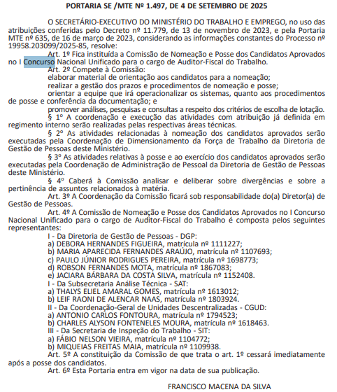 Vale lembrar que, a nomeação foi autorizada pelo Ministério da Gestão e Inovação (MGI) no último dia 4 de setembro, conforme portaria que prevê 855 vagas para o cargo de Auditor-Fiscal do Trabalho no quadro de pessoal do Ministério do Trabalho (MTE).