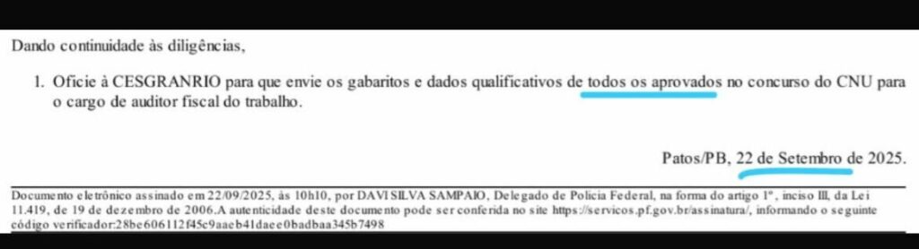A Polícia Federal (PF) solicitou que a banca organizadora Cesgranrio entregue dados dos aprovados para o cargo de Auditor Fiscal do Trabalho (AFT) no Concurso Nacional Unificado (CNU) de 2024. A corporação também pediu pela entrega dos gabaritos das provas aplicadas.