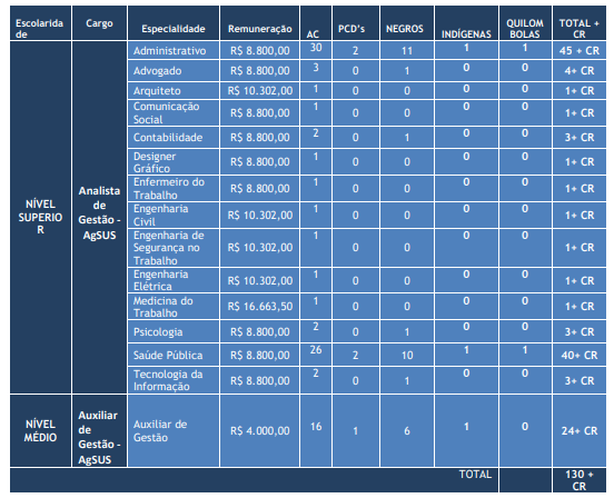 O edital AgSUS oferta 130 vagas, além de oportunidades em cadastro reserva, para cargos de níveis médio e superior.