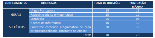 Serão 40 questões de Conhecimentos Gerais e 30 questões de Conhecimentos Específicos, para todos os cargos, contendo cinco alternativas cada e apenas uma resposta correta.