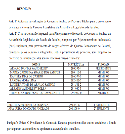 De acordo com o ato publicado, a comissão será composta por sete membros titulares e dois suplentes, todos servidores da Casa, sob a presidência de Alvaro Danas Wagner Jy. A comissão terá amplas atribuições, que incluem desde o planejamento de todas as etapas do concurso até a homologação do resultado final.