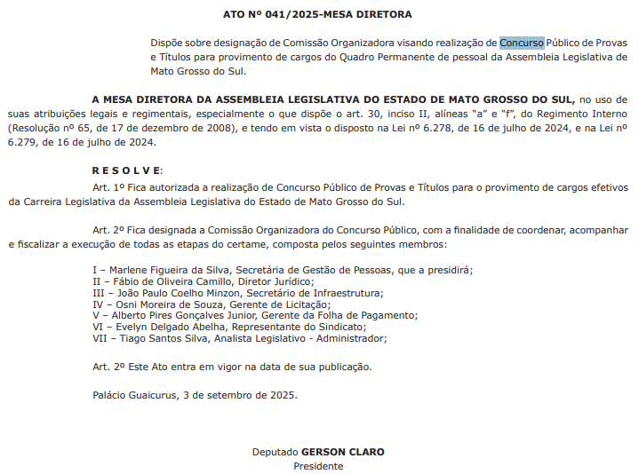 O novo concurso ALEMS (Assembleia Legislativa de Mato Grosso do Sul) está oficialmente autorizado e já conta com comissão organizadora formada!
