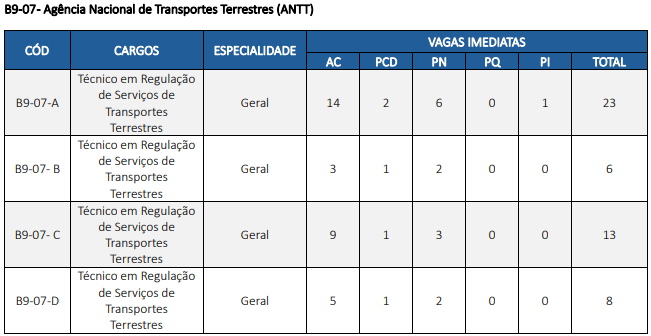 O concurso ANTT foi organizado pelo Cebraspe. Na ocasião, foram ofertadas 50 vagas imediatas para Especialista em Regulação de Serviços de Transportes Terrestres, nas seguintes áreas: