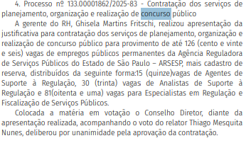 A contratação da banca organizadora do concurso ARSESP (Agência Reguladora de Saneamento e Energia do Estado de São Paulo) foi oficialmente aprovada, abrindo caminho para a definição da instituição responsável pelo certame.