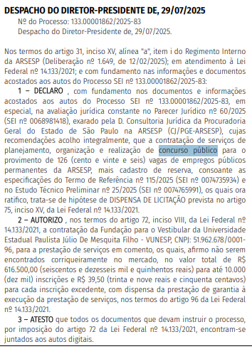 O despacho autorizando a contratação da Vunesp como organizadora da seleção foi publicado em Diário Oficial do estado nesta terça-feira (19/8). Vale lembrar que a contratação da banca foi aprovada no último 15 de agosto, pelo Conselho Diretor.