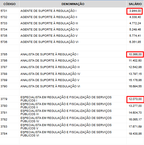 - Especialista em Regulação e Fiscalização de Serviços Públicos: R$ 12.070,00